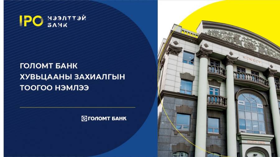 Голомт банк хувьцаны захиалгын тоогоо нэмэхээр боллоо 2022/11/29 Монгол Улсын банкны салбарт тэргүүлэгч Голомт банкны хувьцааны анхдагч зах зээлийн арилжааны нээлт 2022 оны арваннэгдүгээр сарын 23-ны өдөр Монгол хөрөнгийн биржид цан цохих ёслолын үйл ажиллагааг хий…