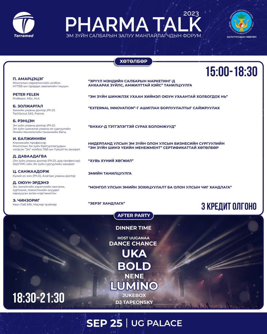 “Pharma Talk 2023” арга хэмжээнд нэгдэж, шилдэг илтгэгч нарын илтгэл, хэлэлцүүлгүүдийг сонссоноор эм зүйч нар гурван кредит нэмж цуглуулах боломжтой.