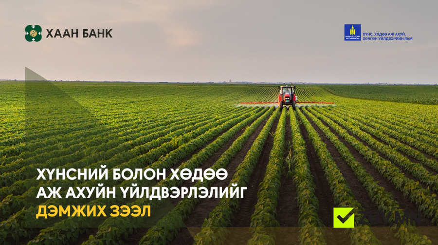 ХААН Банк ХХААХҮЯ-тай хамтран Засгийн газрын хүүгийн хөнгөлөлттэй “Хүнсний болон хөдөө аж ахуйн үйлдвэрлэлийг дэмжих зээл”-ийг орон даяар байрлах салбар нэгжүүдээрээ дамжуулан олгож байна.