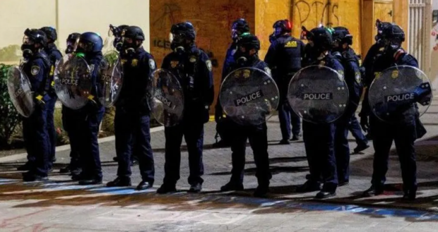 Зураг: Орегон мужийн Портланд хотод энэ сарын 1-нд болсон эсэргүүцлийн жагсаалын үеэр цагдаагийн ажилтнууд Цагаачдыг цагдан хорих газруудыг хамгаалж байгаа нь.