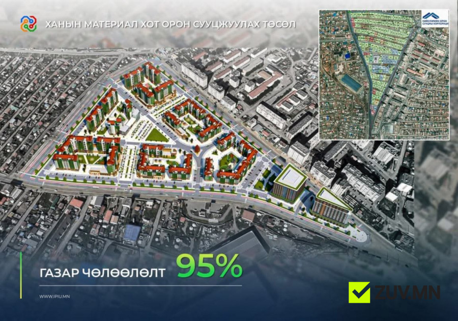 Сонгинохайрхан дүүргийн 5, 6, 7 дугаар хорооны нутаг дэвсгэрт байрлах Ханын материал орчмын гэр хорооллыг орон сууцжуулах төсөл хэрэгжиж байна. Төслийн нэгдүгээр үе шатанд 12.6 га талбайд 1800 айлын орон сууц, хоёрдугаар үе шатанд 1200 айлын орон сууцыг 8.1 га талбайд барина. Нэгдүгээр үе шатанд нийт 232 нэгж талбарыг чөлөөлөхөөс гүйцэтгэл 95 хувьд хүрээд байна.