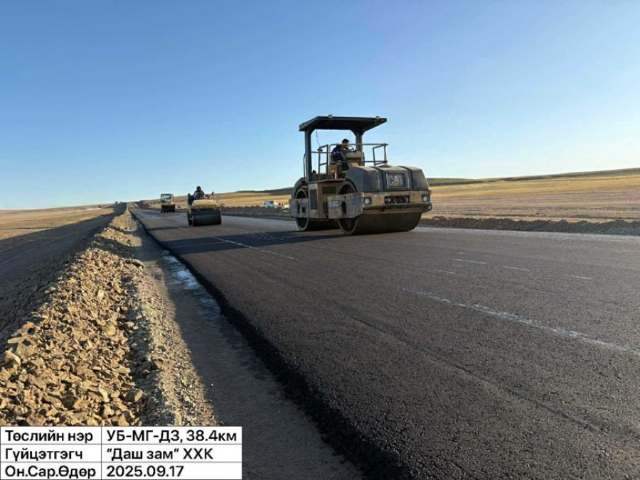 1. Дашзам ХХК-ийн гүйцэтгэж буй УБ-Мандалговь чиглэлийн 60-65 дэх 4.8 км авто замын суурь асфальт цутгалт авсан өнгөн цутгалт болон далан хөвөөний ажил хийгдэж байна. Мөн дээрх чиглэлийн 71-74 дэх 3 км авто замын суурь болон өнгөн асфальт цутгаж цагаан зураас, далан хөвөөний ажил үлдээд байна.