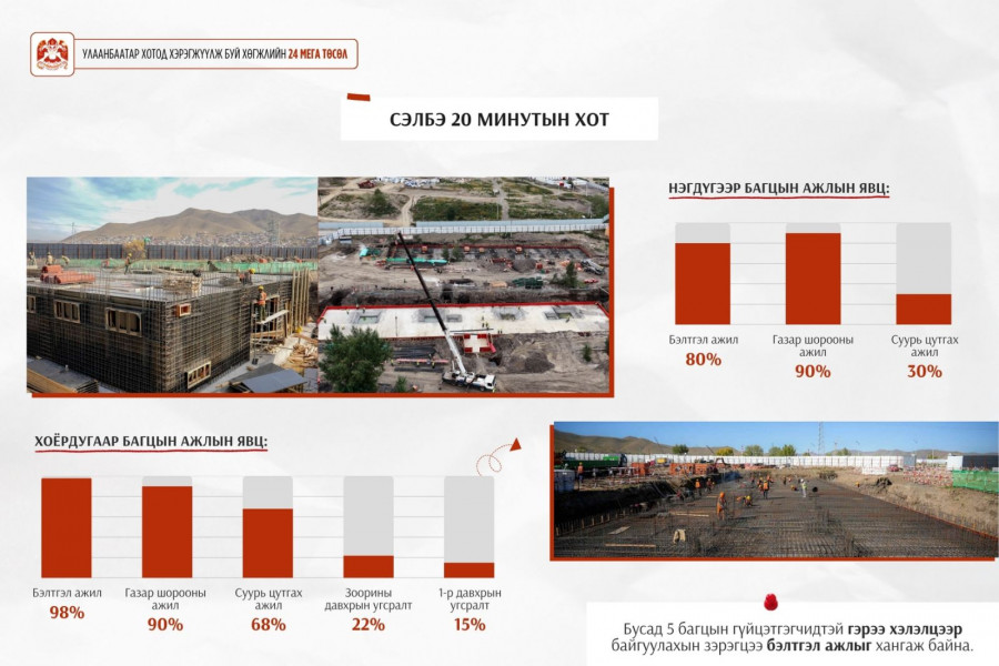 Чингэлтэй, Сүхбаатар дүүргийн 158 га талбайг хамрах 8565 өрхийн орон сууц бүхий анхны жишиг “Сэлбэ 20 минутын хот” төслийн нийт долоон багц бүтээн байгуулалтын ажил үе шаттай үргэлжилж байна.