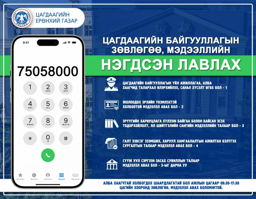 Цагдаагийн байгууллагаас иргэд олон нийтэд жолооны үнэмлэх олгох, эрх сэргээх, галт зэвсгийн бүртгэл, сургалт, гэрээт харуул хамгаалалтын ажилтан бэлтгэх сургалт,  эрүүгийн хариуцлага хүлээж байсан эсэх тодорхойлолт авах зэрэг олон төрлийн үйлчилгээг авах боломжтой цагдаагийн байгууллагын зөвлөгөө, мэдээллийн 75058000 нэгдсэн лавлах ашиглалтад орлоо.