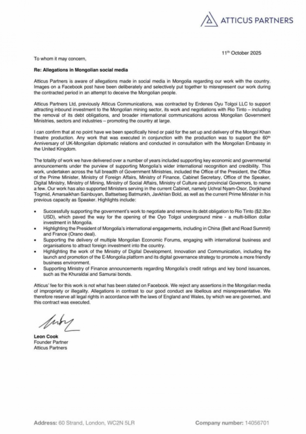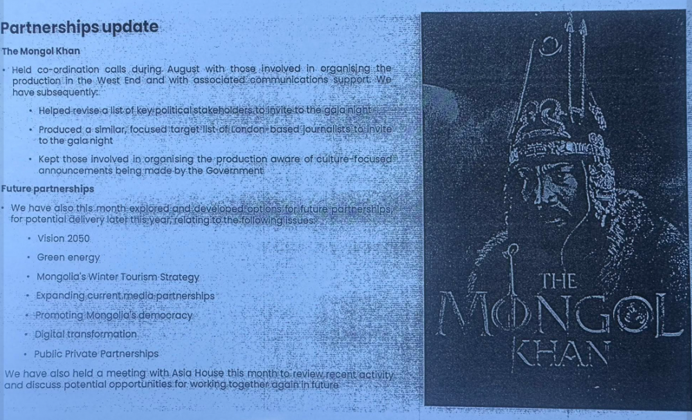 Өөрөөр хэлбэл, “Atticus partners” ГХЯ, “И Монголиа”-тай гэрээ хийх шаардлагагүй, гагцхүү хийж байгаа ажил нь Монголыг эерэгээр таниулах, байр суурийг олон улсын тавцанд өргөх зорилготой тохирч байсан учраас үйл ажиллагааг нь сурталчилсан гэсэн үг.