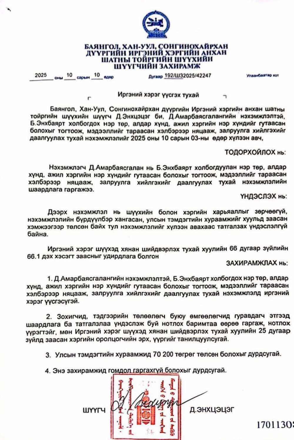 Тэгвэл энэ сарын 10-нд Баянгол, Хан-Уул, Сонгинохайрхан дүүргийн Иргэний хэргийн анхан шатны шүүхээс Д.Амарбаясгалангийн нэхэмжлэлтэй, Б.Энхбаярт холбогдох нэр төр, алдар хүнд, ажил хэргийн нэр хүндийг гутаасан болохыг тогтоож, мэдээллийг тараасан хэлбэрээр няцааж, залруулга хийлгэхийг даалгуулах тухай нэхэмжлэлд иргэний хэрэг үүсгэх захирамж гаргасан байна.