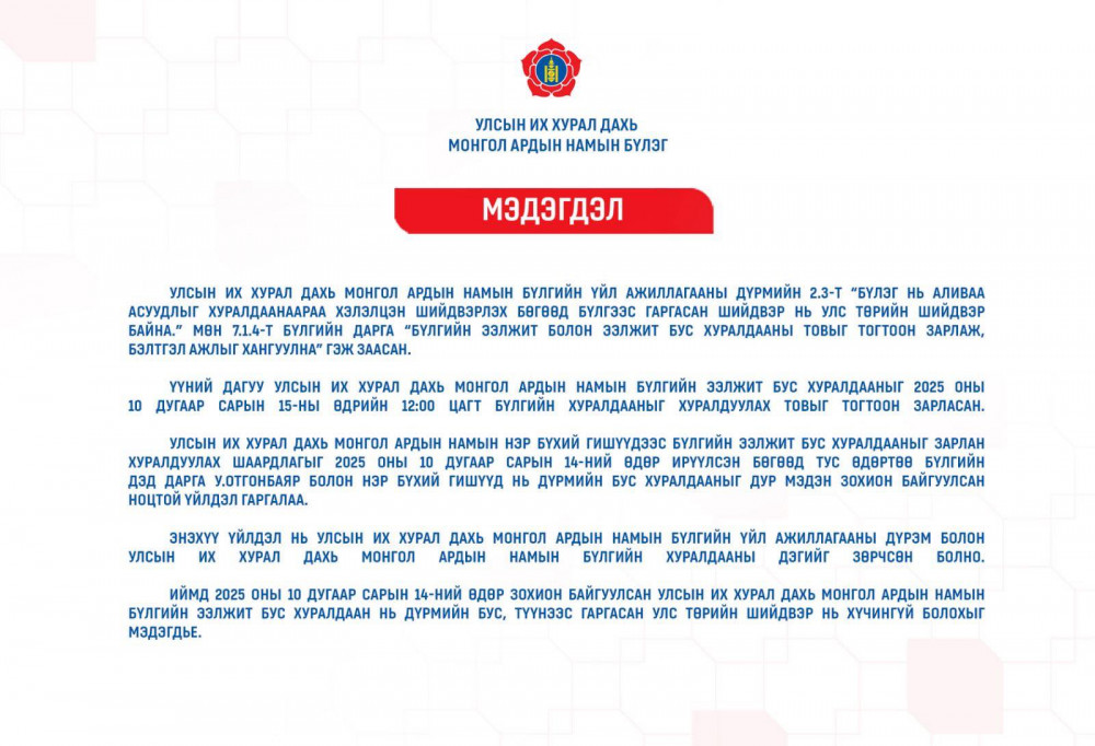 УИХ дахь МАН-ын бүлэг жинхэнэ утгаараа хоёр хуваагдав. Өчигдөр У.Отгонбаяраар удирдуулан хуралдсан 38 гишүүнтэй МАН-ын бүлэг өнөөдөр /2025.10.15/ дахин хуралдаж, шинэ даргаараа Ж.Батжаргалыг сонголоо.