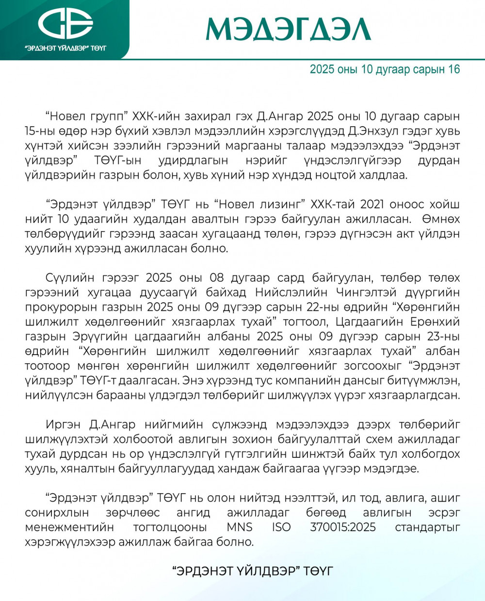 Өчигдөр /2025.10.15/ Новел групп” ХХК-ийн захирал Д.Ангар мэдээлэл хийсэнтэй холбогдуулан Эрдэнэт үйлдвэр ТӨҮГ мэдэгдэл гаргажээ.