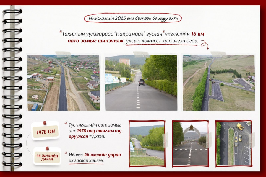 Харин энэ онд үлдсэн 12 км авто замыг шинэчилж, гэрэлтүүлэг, явган замын ажлыг дуусган улсын комисст хүлээлгэн өгөөд байна. Тахилтын уулзвараас “Найрамдал” зуслан чиглэлийн авто замыг анх 1978 онд ашиглалтад оруулсан бөгөөд 46 жилийн дараа их засвар хийлээ.