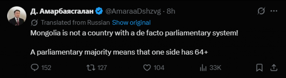 Цэцийн гишүүн О.Мөнхсайхан дүгнэлтийг олон нийтэд танилцуулсны дараа УИХ-ын гишүүн Д.Амарбаясгалан твиттер хуудастаа "Монгол Улс де факто Парламентын засаглалгүй улс болов. Парламентын олонх гэдэг нь аль нэг тал 64+" хэмээн бичсэн байна.
