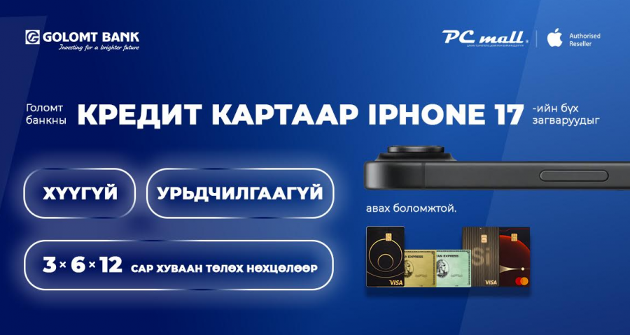 Голомт банкны кредит картаар Iphone 17 гар утсыг хүүгүй, урьдчилгаагүй нөхцөлөөр худалдан аваарай