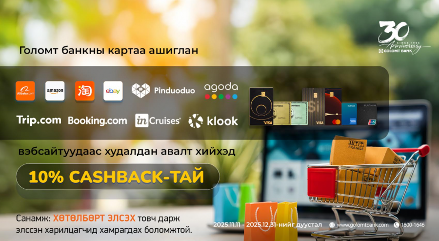 Хэрэв та Голомт банкны Visa, Mastercard, American Express, UnionPay брэндийн кредит картын эзэмшигч бол доор дурдсан вэбсайтуудаас онлайн худалдан авалт хийж, төлбөрөө төлөөд үнийн дүнгийнхээ 10%-ийг буцаан аваарай.