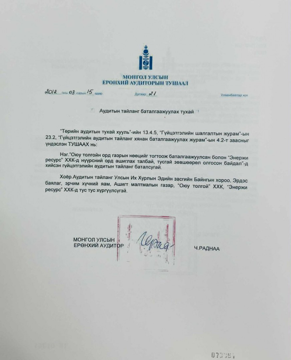 Тэгвэл 2008 онд явагдсан энэхүү хэлэлцээрийн үйл явц, хууль журмын хэрэгжилт дээр Үндэсний аудитын газраас 2012 онд шалгалт хийж, аудитын дүгнэлт гаргасан болохыг “Тавантолгойн цагаан толгой” номонд баримттай нь бичиж нийтэлжээ.