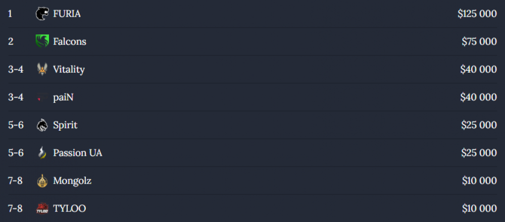 Түрүүлсэн “FURIA Esports” 125,000, удаалсан “Team Falcons” 75,000 ам.долларын шагнал хүртсэн бол 3-4 байрт орсон “Team Vitality”, “paiN Gaming” багууд тус бүр 40,000 ам.долларын шагнал авсан байна.