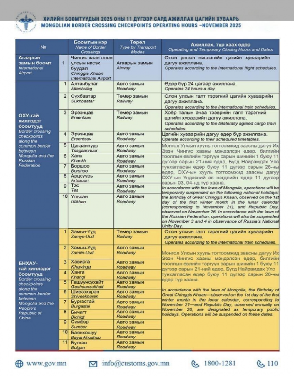 “Их Эзэн Чингис хааны мэндэлсэн өдөр”, Бүгд Найрамдах Улс тунхагласан өдөр энэ сарын 21, 26-нд тохиож байгаатай холбоотойгоор хилийн зарим боомтууд амарна. Баярын өдрүүдээр амрах болон ажиллах боомтуудын талаарх мэдээллийг хүргэж байна.