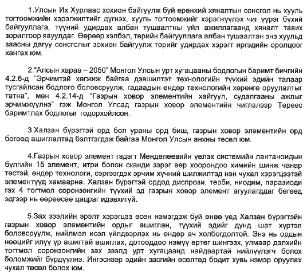 1.Монгол Улсын газрын ховор элемент хайгуул, ашиглалтын үйл ажиллагаа явуулах эрх зүйн орчин дахь тулгамдсан асуудал, хуулийн нийцлийг хангах, давхардлыг арилгах талаар Улсын Их Хурлын гишүүдийн зүгээс санаачилга гаргах. Тухайлбал: газрын ховор элементийн хайгуул, ашиглалтын үйл ажиллагаа явуулах, гадаадын хөрөнгө оруулалт татахад саад учруулж, давхардал үүсгэж буй Ашигт малтмалын тухай хууль болон Цөмийн энергийн тухай хуулиудын хийдлийг арилгаж, цаашид энэ чиглэлийн үйл ажиллагаа явуулах эрх зүйн орчныг тодорхой болгох хууль тогтоомжид өөрчлөлт оруулах санал боловсруулах;