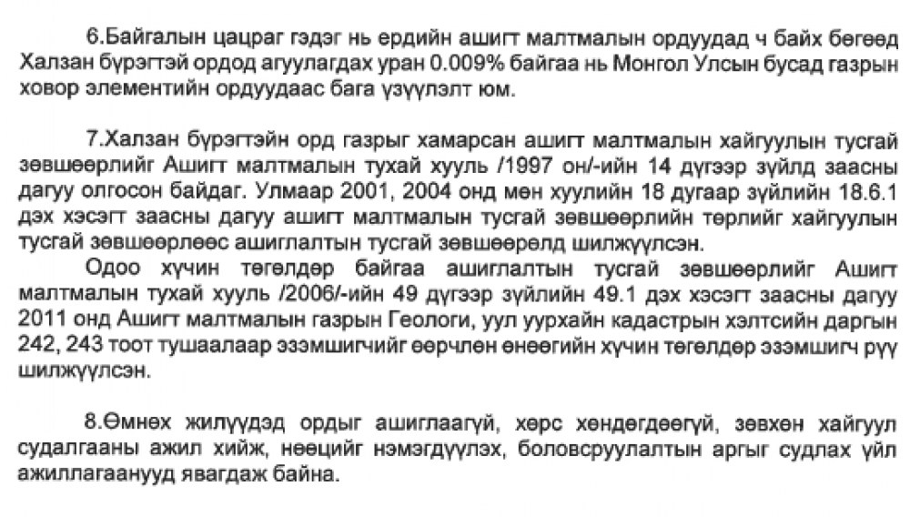 Хамгийн гол нь, Сонсголоос Халзанбүрэгтэй орд нь ураны биш, газрын ховор элементийн орд, яг энэ төрлийн ашигт малтмалаар эргэлтэд ороход бэлтгэгдэж байгаа Монголын анхны орд гэдгийг бататгаж, Ашигт малтмалын тусгай зөвшөөрөл нь хүчинтэй, одоогийн хүчин төгөлдөр эзэмшигчдээ хуулийн дагуу /тухайн үед мөрдөгдөж байсан Ашигт малтмалын тухай хуулийн 49.1/ шилжсэн бөгөөд түүнээс хойш олборлолтын ажиллагаа огт явуулаагүй болохыг баталсан явдал.