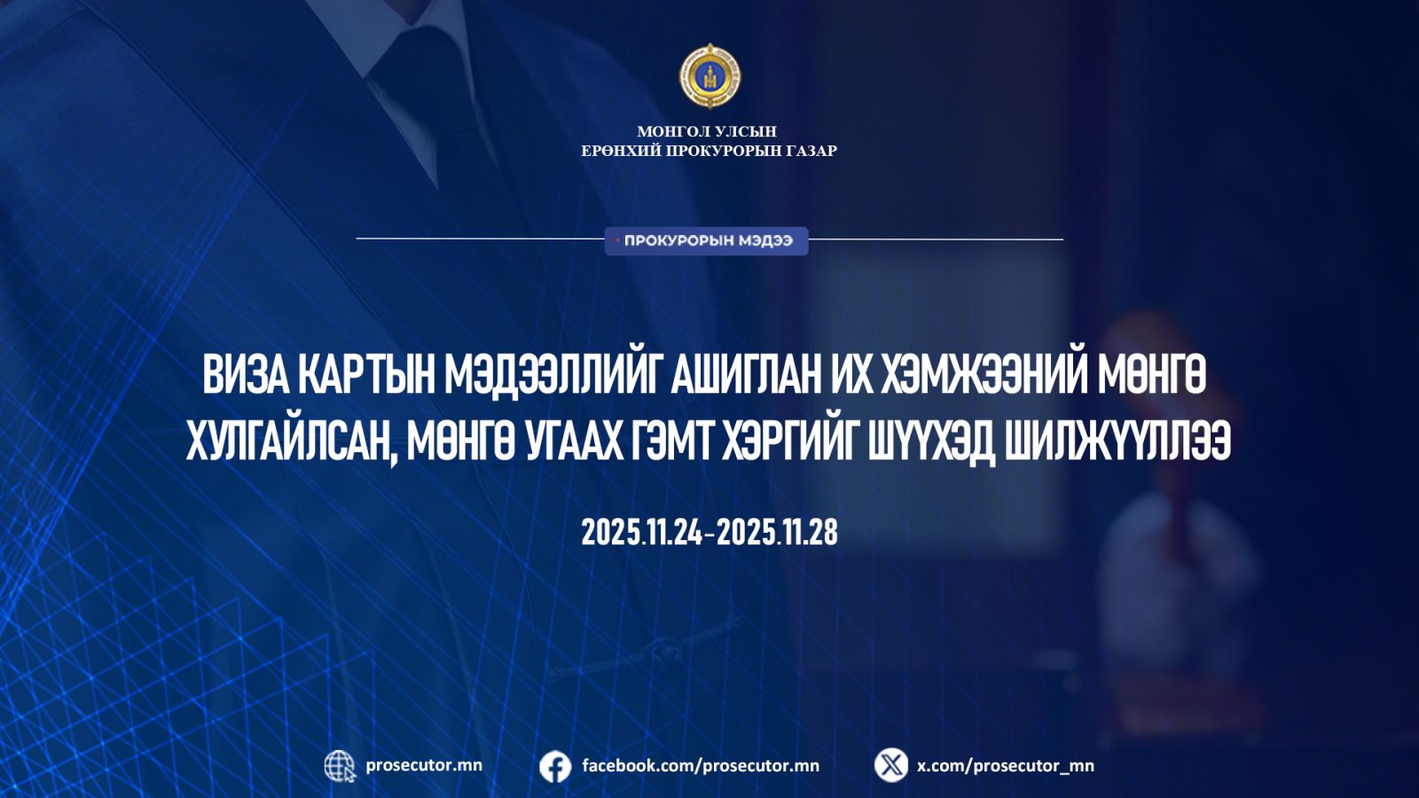 Прокурорын байгууллага 2025 оны 11 дүгээр сарын 24-ний өдрөөс 28-ны өдрийг дуусталх хугацаанд хэрэг бүртгэлт, мөрдөн байцаалтын 50746 эрүүгийн хэрэгт хяналт тавин ажиллажээ.