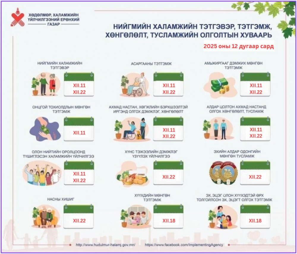 Хөдөлмөр, нийгмийн халамжийн үйлчилгээний ерөнхий газраас энэ сард олгох тэтгэвэр, тэтгэмжийн хуваарийг танилцуулжээ.