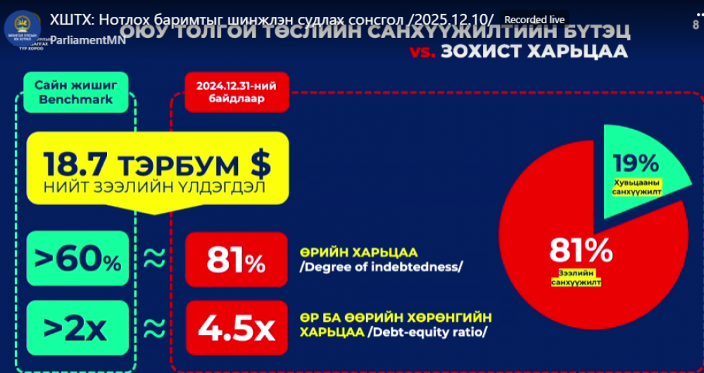 “Оюутолгой” ХХК-ийн өрийн хэмжээ өөрийн хөрөнгөөс 4.5 дахин их байгаа нь олон улсын жишгээс 2.5 дахин хэтэрсэн байна.