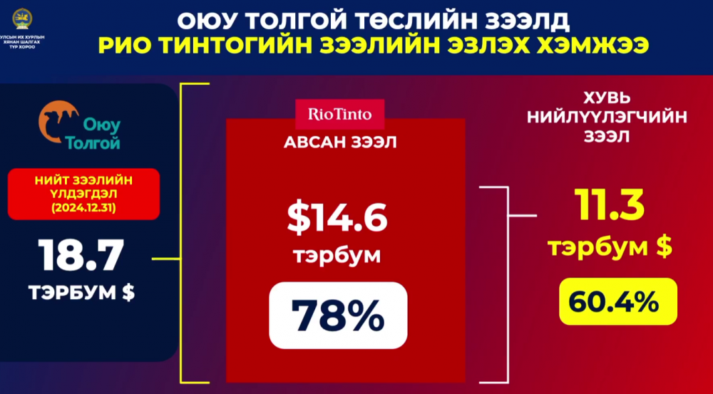 2024 оны арванхоёрдугаар сарын 31-ний байдлаар 18.7 тэрбум ам.долларын өртэй байгаагийн 14.6 тэрбум ам.доллар нь "Рио Тинто"-гоос авсан, 11 хувийн хүүтэй зээл байна.