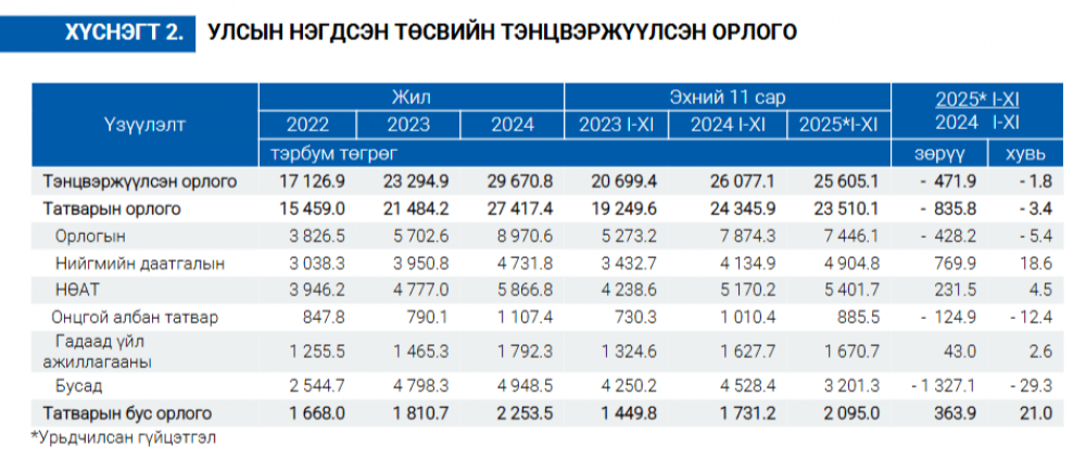 Улсын нэгдсэн төсвийн нийт орлого, тусламжийн хэмжээ 2025 оны эхний 11 сарын урьдчилсан гүйцэтгэлээр 27.6 их наяд төгрөг болж, өмнөх оны мөн үеэс 171.5 (0.6 хувь) тэрбум төгрөг, тэнцвэржүүлсэн орлого тусламжийн хэмжээ 25.6 их наяд төгрөг болж, өмнөх оны мөн үеэс 471.9 (1.8 хувь) тэрбум төгрөгөөр тус, тус буурчээ.