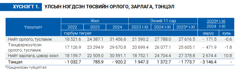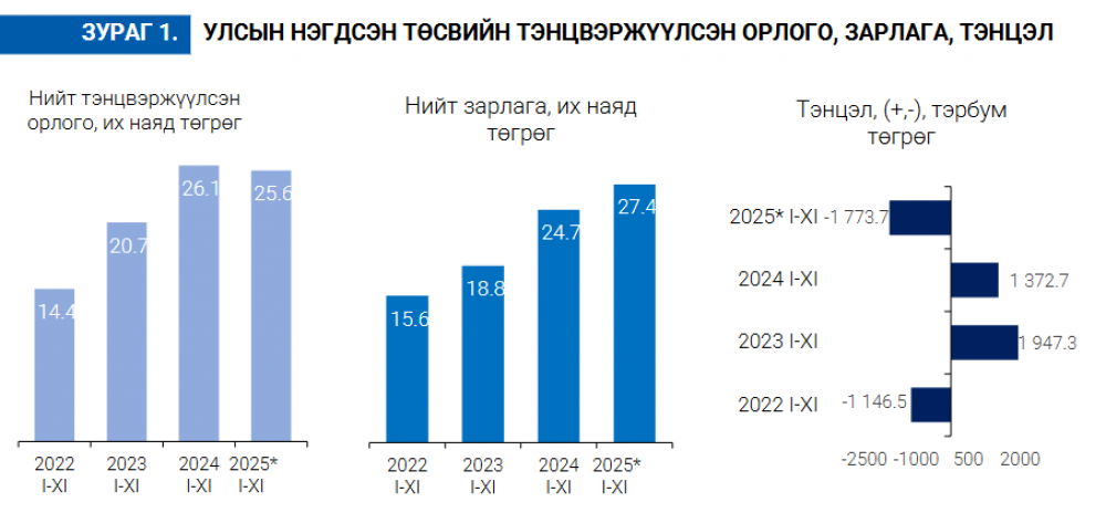 Нийт зарлага, эргэж төлөгдөх цэвэр зээлийн хэмжээ 2025 оны эхний 11 сард 27.4 их наяд төгрөгт хүрч, тэнцвэржүүлсэн тэнцэл 1.8 их наяд төгрөгийн алдагдалтай гарсан байна.