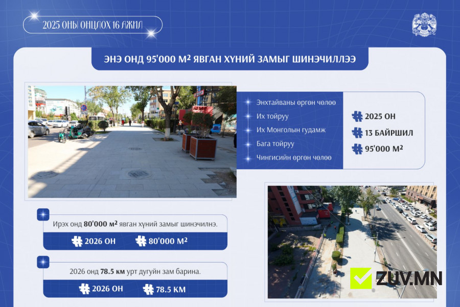Энэ онд Улаанбаатар хотын гол гудамж, замууд болох Энхтайваны өргөн чөлөө, Их тойруу, Бага тойруу, Их Монголын гудамж болон Чингисийн өргөн чөлөө дагуух 13 байршилд 95 мянган ам.метр явган хүний замыг шинэчиллээ.