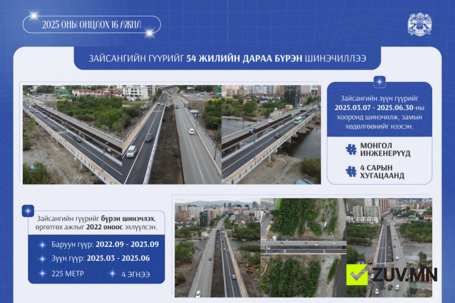 Энэ онд Зайсангийн зүүн гүүрийг өргөтгөж шинэчлэх ажлыг үндэсний бүтээн байгуулагчид, монгол инженерүүд дөрвөн сарын хугацаанд хийж гүйцэтгэлээ.