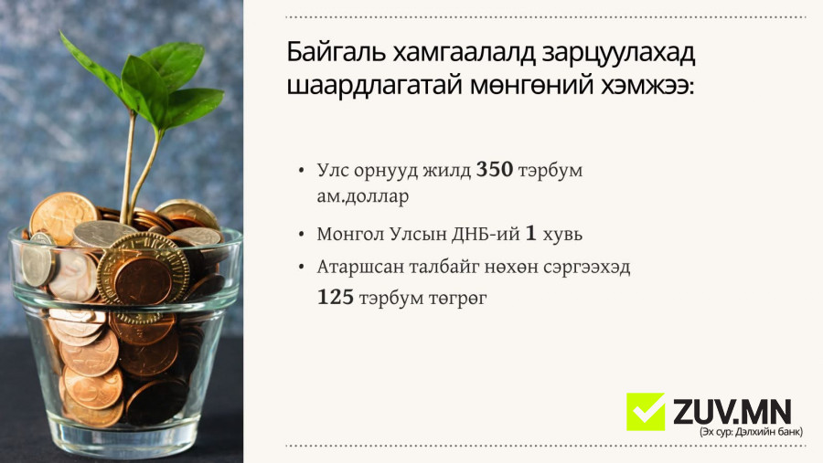 Дэлхийн банкны мэргэжилтнүүдийн гаргасан тооцооллоос сонирхуулая. Улс орнууд жилд хамгийн багадаа 350 тэрбум ам.долларыг байгаль хамгаалахад зарцуулбал хүлэмжийн хийг багасгаж, ган цөлжилтийг сааруулж чадна гэж мэдэгдсэн. Харин манай эрдэмтдийн тооцоогоор Монгол Улс ДНБ-ийхээ ядаж 1%-ийг байгаль орчны хамгаалалд зарцуулах хэрэгтэй гэж үзэж байгаа юм. Цаашлаад Монгол орны хэмжээнд зөвхөн атаршсан талбайг нөхөн сэргээхэд л 125 тэрбум төгрөг шаардлагатай гэсэн тооцоо ч байдаг.