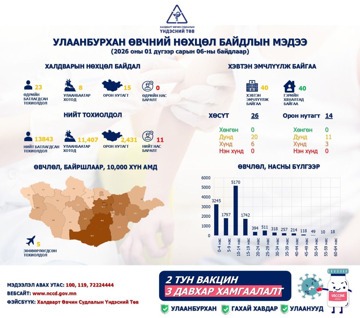 Улаанбурхан өвчнөөр өвчилсөн 13843 тохиолдол бүртгэгдээд байгаа бөгөөд дийлэнх тохиолдол нь Улаанбаатар хотод бүртгэгдсэн байна.
