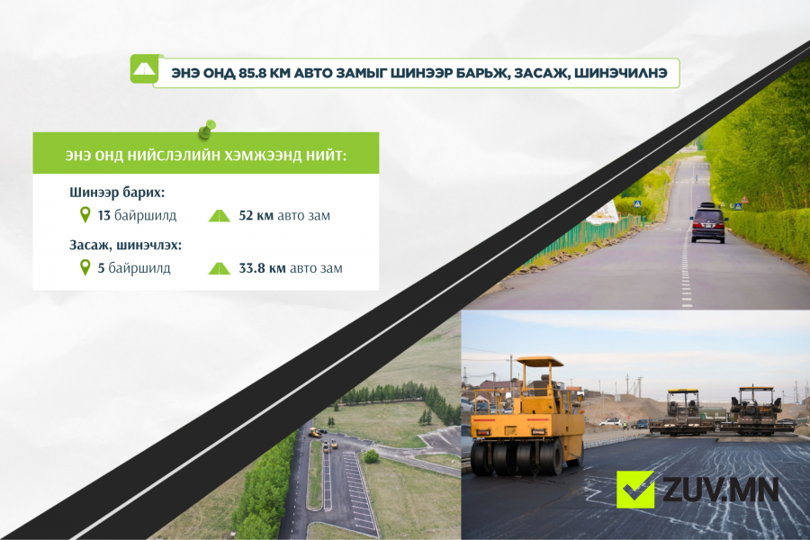 Энэ онд нийслэлийн хэмжээнд 13 байршилд 52 км авто зам, замын байгууламжийг шинээр барина. Таван байршилд 33.8 км авто замын засвар, шинэчлэлт хийнэ. Нийт 85.8 км авто зам, замын байгууламжийг шинээр барьж, засаж, шинэчлэх юм. Мөн хоёр байршилд явган хүний гүүрэн гарц, хоёр байршилд 31 км гэрэлтүүлэг хийнэ. Харин авто зам, замын байгууламжийн засвар, арчлалтын хүрээнд дараах ажлуудыг хийхээр төлөвлөлөө.