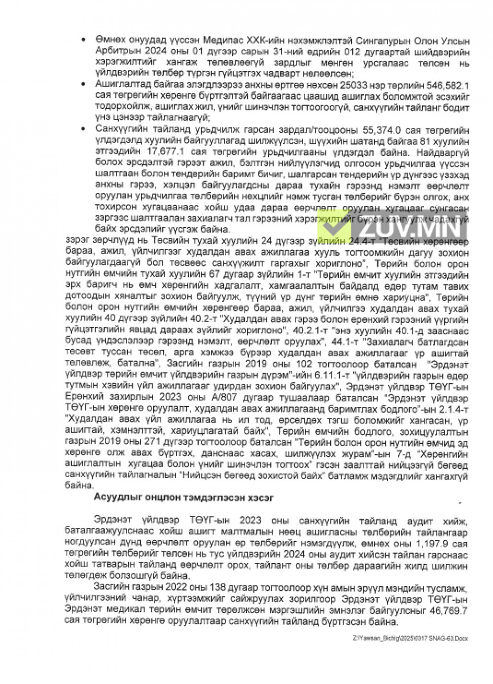 28 тэрбумын гурван асуудалд зөрчлийг таслан зогсоох, сахилгын хариуцлага тооцуулах албан шаардлага тус тус хүргүүлжээ