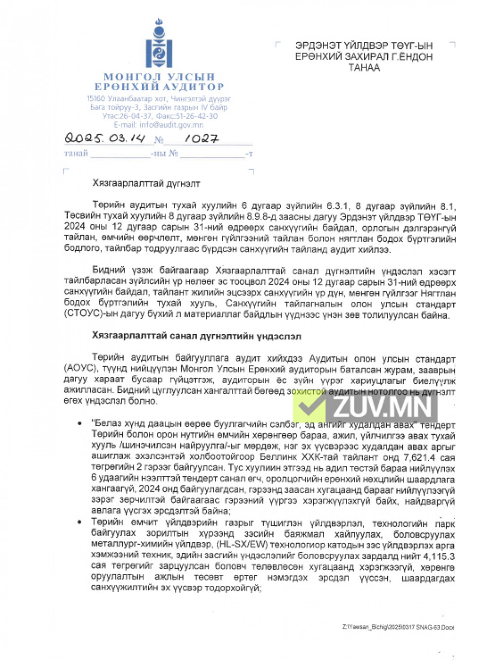Санхүүгийн тайлангийн аудитаар 28 тэрбум 112.2 сая төгрөгийн 3 асуудалд зөрчлийг таслан зогсоох, сахилгын хариуцлага тооцуулах албан шаардлага тус тус хүргүүлжээ.