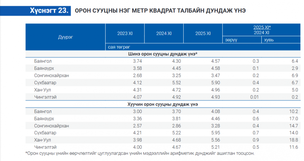 2025 оны 11 дүгээр сард шинэ орон сууцны 1 метр квадрат талбайн дундаж үнэ 4.97 сая төгрөг болж, Сүхбаатар дүүрэгт хамгийн өндөр буюу 5.9 сая төгрөгийн үнэтэй байна. Шинэ орон сууцны дундаж үнэ өмнөх оны мөн үетэй харьцуулахад Сонгинохайрхан дүүрэгт 6.9 хувь (224.1 мянган төгрөг)-аар өссөн нь хамгийн өндөр, Чингэлтэй дүүрэгт 0.2 хувь (8.0 мянган төгрөг)-аар өссөн нь хамгийн бага байна.