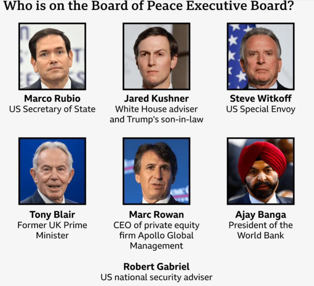 Гүйцэтгэх зөвлөлийн гишүүдэд Их Британийн Ерөнхий сайд асан Тони Блэйр, АНУ-ын Төрийн нарийн бичгийн дарга Марко Рубио, Трампын хүргэн Жаред Кушнер, Дэлхийн банкны ерөнхийлөгч Ажай Банга нарын зэрэг /зураг/ хүмүүс багтсан байна.