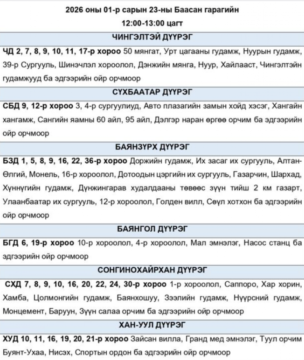 Эрчим хүчний чадлын дутагдлаас шалтгаалан нэгдүгээр сарын 23-ны баасан гарагт зарим газар цахилгаан эрчим хүчний хязгаарлалт хийж болзошгүй гэдгийг УБЦТС ТӨХК-иас мэдээллээ.