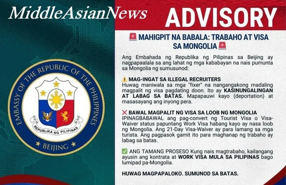 Бээжин дэхь Филиппиний ЭСЯ Монгол Улс дахь хууль бус хөдөлмөр зуучлагчдаас болгоомжлохыг анхааруулсан сэрэмжлүүлэг гаргажээ. Түүндээ Филиппиний иргэд нь Монгол Улсад 22 хоногийн хугацаанд визгүй зорчих эрхтэй бөгөөд энэ хугацаанд хөдөлмөр эрхлэх боломжгүй. Тиймээс Монголд байдаг, “Хөдөлмөр эрхлэх виз олж өгнө” гэх залилагчдаас болгоомжлохыг сануулсан байна.