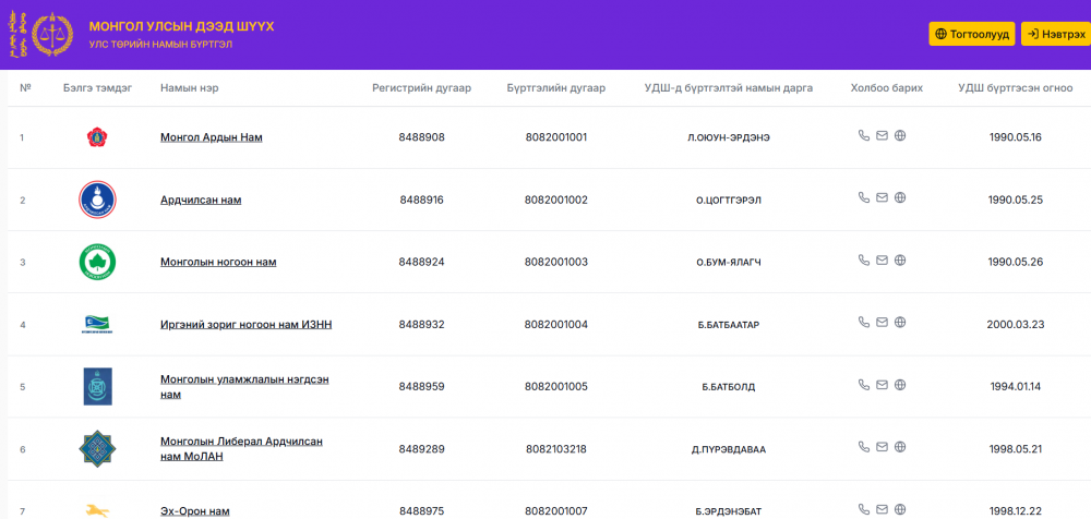 Түүнчлэн, Ардчилсан намын даргаар О.Цогтгэрэл, “Үндэсний эвсэл”-д багтдаг Ногоон намын даргаар О.Бум-Ялагч, МҮАН-ын даргаар Б.Цогтгэрэл, Монголын либерал Ардчилсан намын даргаар Б.Пүрэвдаваа, ИЗНН-ын даргаар Б.Батбаатар, ХҮН намын даргаар Т.Доржханд нар бүртгэлтэй байгаа бол бүртгэлтэй нийт 37 намаас Монголын эмэгтэйчүүдийн үндэсний нэгдсэн нам, Монголын социал демократ нам, Ард түмний нам, Монголын ардчилсан хөдөлгөөний нам, Үнэн ба зөв нам зэрэг 16 намын даргын бүртгэл харагдахгүй байна.