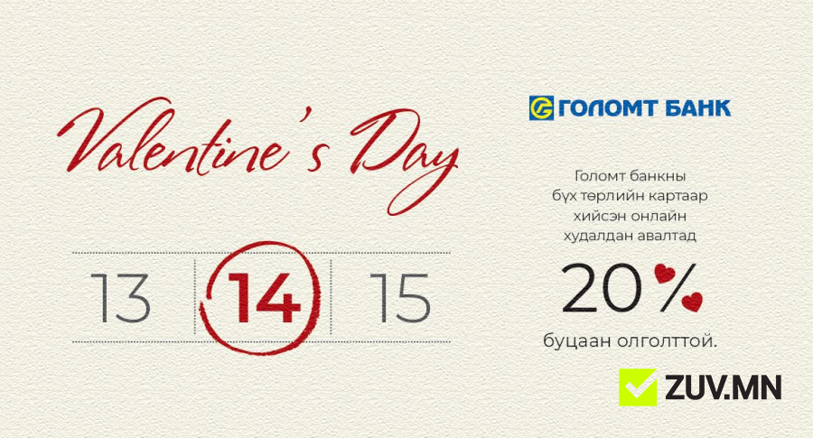 Гэгээн хайрын өдөр буюу Валентины баярын өдөр тун удахгүй болох гэж байна. Харин танд хайртай хүндээ хамгийн нандин бэлэг сонгох, үзвэр үйлчилгээний тасалбараа захиалах хэрэгцээ шаардлага гарч байна уу? Тэгвэл Голомт банк бүх төрлийн карт эзэмшигчдэдээ зориулан 2026.02.05-2026.02.14-ний өдрийг дуустал “Happy Valentine’s Day” урамшуулалт аяныг зарлаж байна.