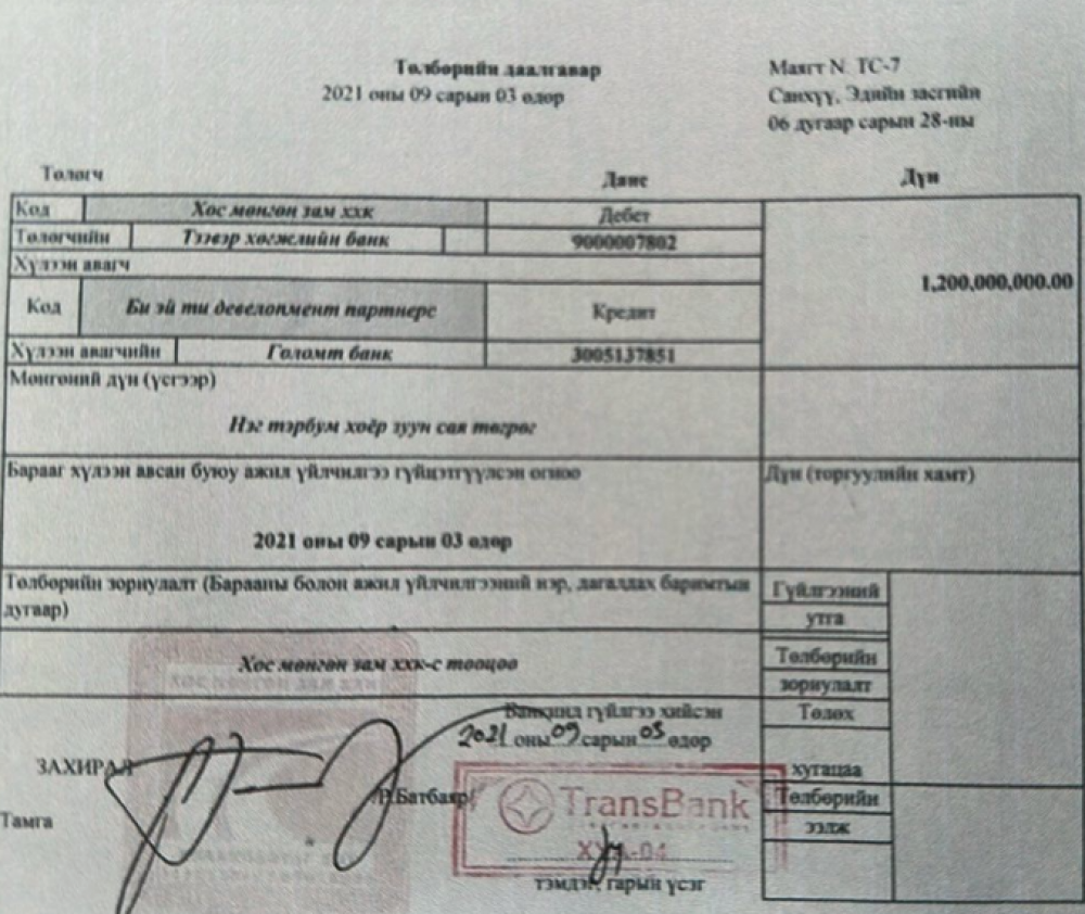Мөн компанийн данснаас 2021 оны тавдугаар сараас наймдугаар сарын хооронд бэлнээр 2.7 тэрбум төгрөг зарлагадаж, 2.0 тэрбумыг нь 500 сая, 500 сая, 1.0 тэрбумаар нь “Би Эй Ти девелопмент партнерс” ХХК руу шилжүүлсэн.