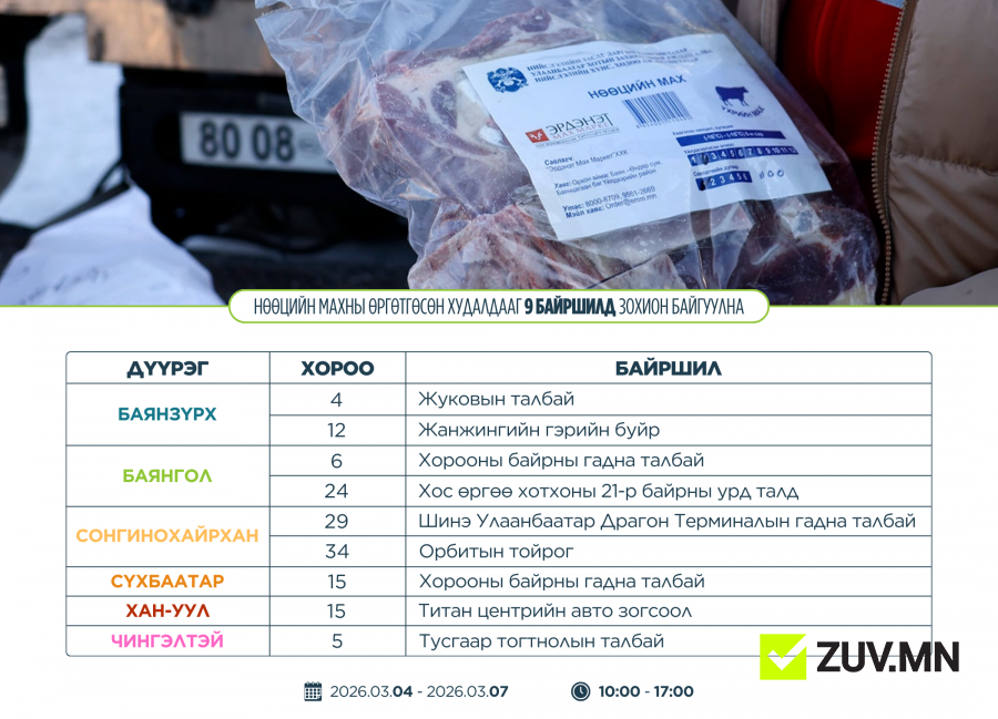 Үхрийн мах 15 мянга, хонины мах 13 мянган төгрөгийн үнэтэй борлуулагдаж буй. Мөн иргэдийн эрэлт хэрэгцээнд тулгуурлан нөөцийн махны өргөтгөсөн худалдааг гуравдугаар сарын 4-7-ныг хүртэл 10:00-17:00 цагийн хооронд есөн байршилд зохион байгуулна. Ингэхдээ хонины махыг гулуузаар, 1 кг нь 13 мянган төгрөгөөр худалдан борлуулах юм.