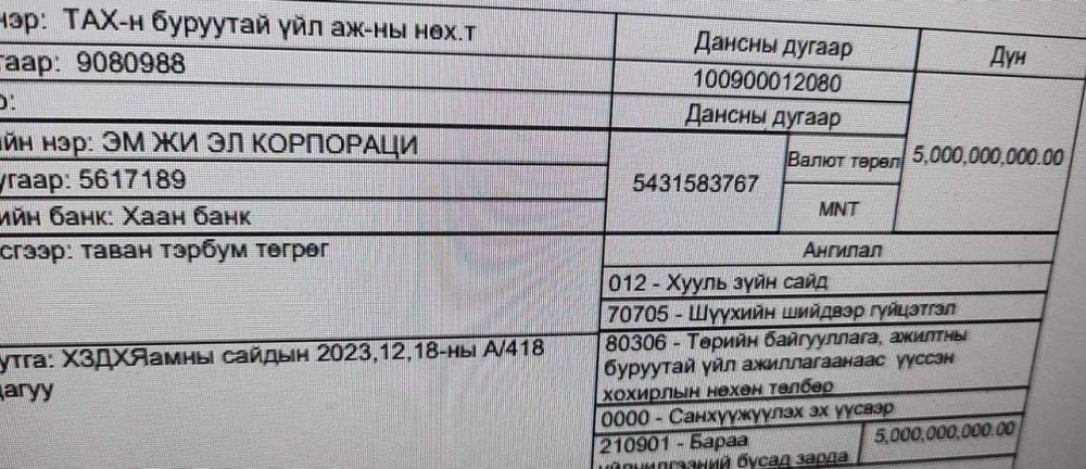 Уг гүйлгээг 2023 оны 12 сарын 18 өдрийн А/418 тоот тушаалын дагуу Төрийн сангаас шилжүүлсэн бөгөөд уг гүйлгээний ХЗДХЯ ны Шилэн дансны мэдээлэлд байсан бөгөөд одоо устгагдсан байна. Миний өөрийн мэдээллийн санд 2023.12.25 өдрийн 18:57 цагт бүртгэгдсэн байна" гэжээ.