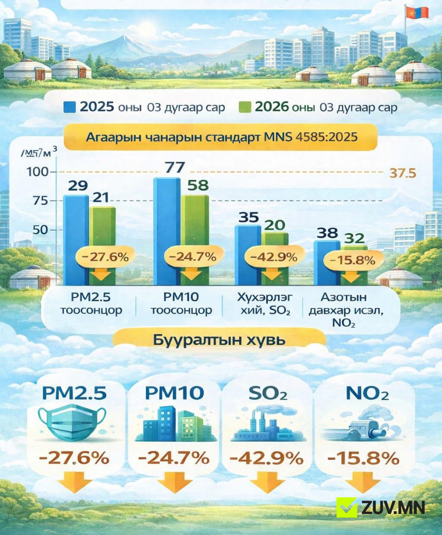 Цаг уур, орчны шинжилгээний газраас Улаанбаатар хотын агаарын чанарын 2026 оны 03 дугаар сарын төлөв байдлын мэдээллийг гаргалаа.
