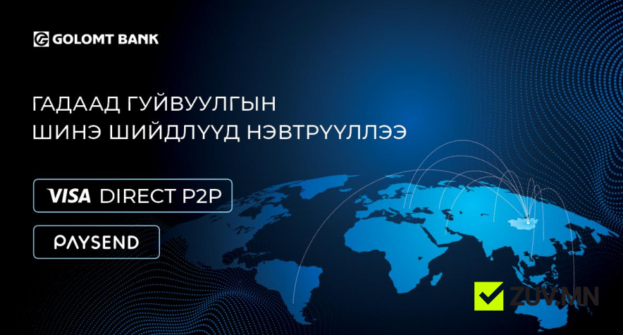 Голомт банк харилцагчдынхаа олон улсын төлбөр тооцооны хэрэгцээнд нийцсэн, найдвартай, орчин үеийн дижитал санхүүгийн шийдлүүдийг тасралтгүй санал болгож ирсэн. Энэ хүрээнд олон улсын мөнгөн гуйвуулгын үйлчилгээнд тэргүүлэгч Visa Worldwide Pte. Limited-ийн Visa Direct P2P болон Paysend PLC байгууллагын Paysend үйлчилгээг амжилттай нэвтрүүлж, харилцагчдадаа олон улсын шилжүүлгийг илүү хялбар, найдвартай гүйцэтгэх боломжийг олгож байна.