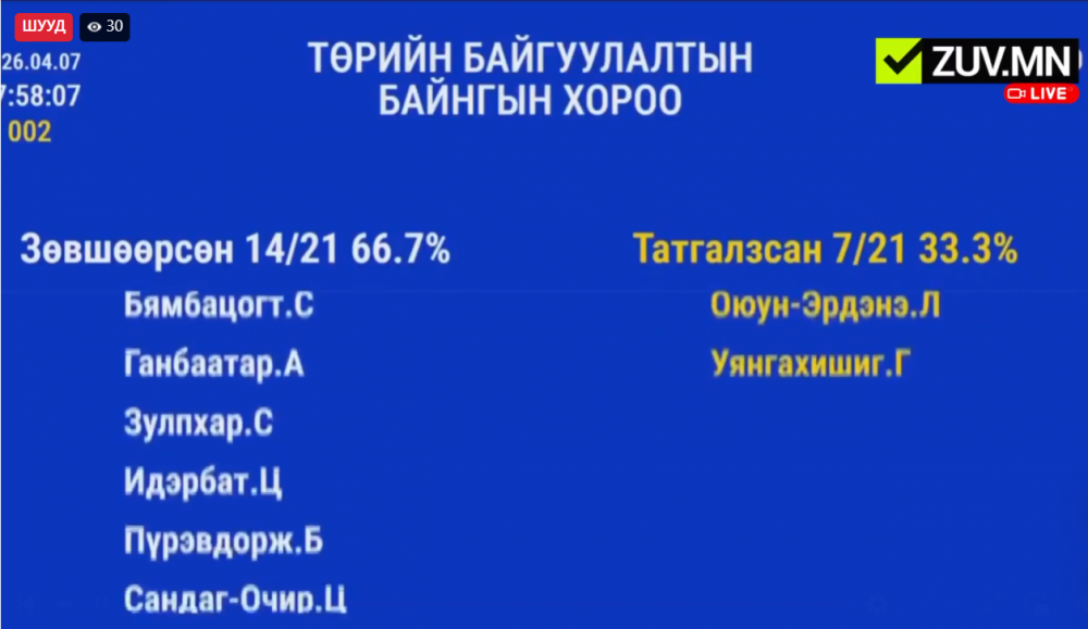 Хууль санаачлагч талаас ЕТГ-ын дарга А.Үйлстөгөлдөр, Ажлын хэсгийн гишүүн А.Бямбажаргал тэргүүтэй хүмүүс оролцож, Байнгын хорооны гишүүдийн асуудлтад хариулт өгсний дараа санал хураахад 21 гишүүн оролцсоноос 14 гишүүн дэмжиж, долоон гишүүн татгалзсанаар хуулийн төслийг үзэл баримтлалын хүрээнд дэмжлээ.