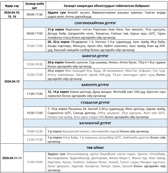 Өнөөдөр таван дүүргийн 11 байршилд хэсэгчилсэн байдлаар 09:00-17:30 цаг хүртэл цахилгаан хязгаарлаж, шугам сүлжээнд засвар хийх юм байна.
