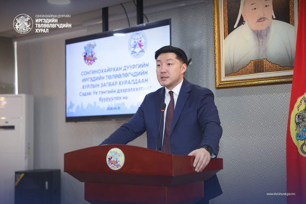 Сурагчдад хууль, эрх зүйн мэдлэг олгох, нутгийн өөрөө удирдах байгууллагын үйл ажиллагааг танилцуулах зорилгоор “Үе тэнгийн дээрэлхэлтийг таслан зогсоох нь” сэдэвт дүүргийн иргэдийн Төлөөлөгчдийн Хурлын “ЗАГВАР ХУРАЛДААН”-ыг өнөөдөр /2026.04.15/ англи хэл дээр зохион байгууллаа. Арга хэмжээг иргэдийн Төлөөлөгчдийн Хурлын дарга Б.Золбоо нээж үг хэлэв.