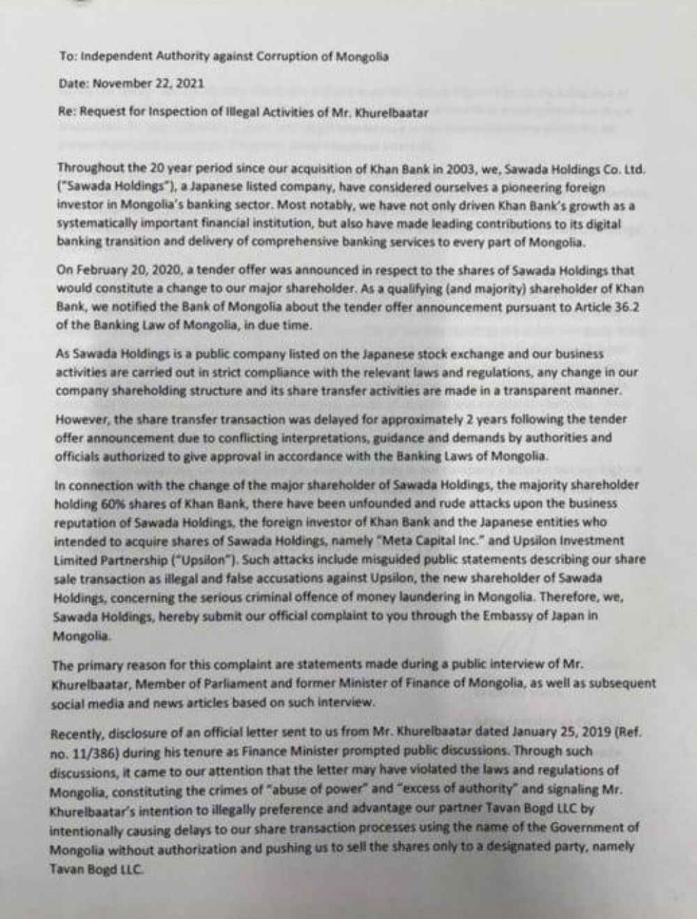 Тэрбээр уг гомдолдоо “Японы хөрөнгийн биржид бүртгэлтэй Sawada Holdings компани нь 2003 онд ХААН банкийг худалдан авсан цагаас хойш 20 жилийн хугацаанд Монгол Улсын банкны салбарт хөрөнгө оруулалт хийсэн томоохон анхдагч байгууллагуудын нэг билээ. Бид ХААН банкийг банк санхүүгийн салбарын системийн чухал банк болгох өсөлтөд түлхэц өгөхийн зэрэгцээ тус банкны дижитал шилжилт, банкны цогц үйлчилгээг Монгол орны өнцөг булан бүрт хүргэхэд үнэтэй хувь нэмэр оруулсан.