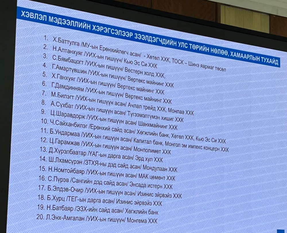 Танилцуулгыг Ажлын хэсгийн ахлагч, УИХ-ын гишүүн Б.Баттөмөр хийсэн юм. Энэ үеэр тэрбээр АТГ-т өгч шалгуулах шаардлагатай нэр бүхий 20 УИХ-ын гишүүд, улс төрчдийн нэрийг зарлалаа. Тодруулбал,